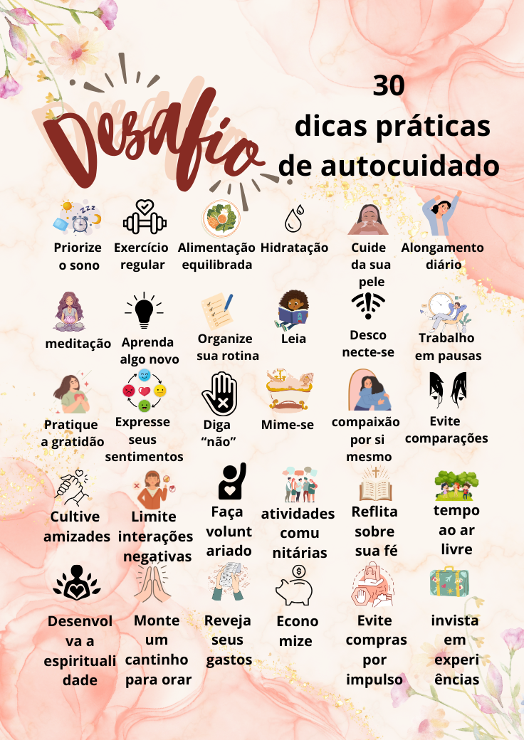 Aqui estão 30 dicas práticas de autocuidado, organizadas por áreas da vida: